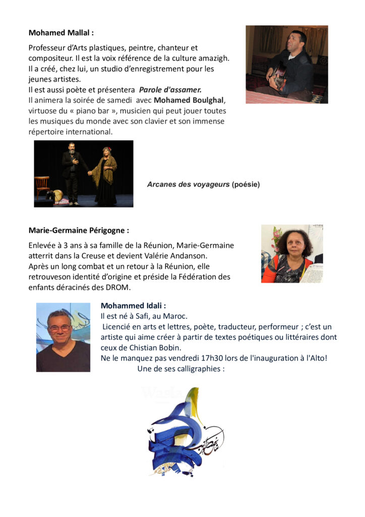 21h soirée (Alto) : Soirée musique du monde :  poésie, chants et concert d’un groupe amazigh (Ouarzzazat (Maroc), direction Mohamed Mallal (peintre, poète, compositeur/interprète)
